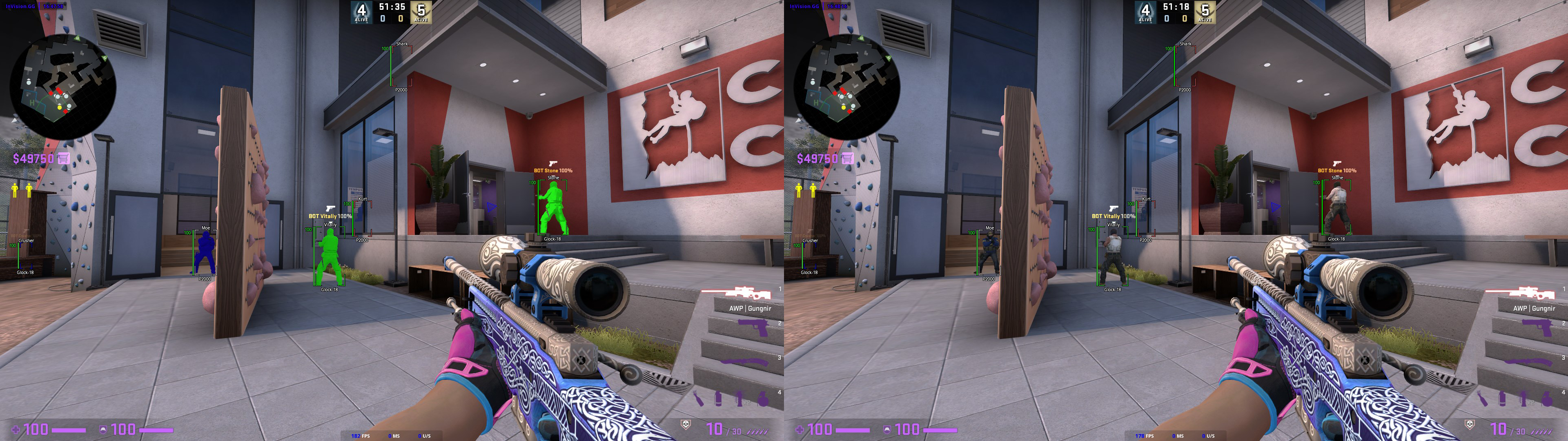 'Streamproof Visuals' is a feature to make the visual effects of a CSGO cheat invisible for your broadcaster software. As a result, features from the ESP/Wallhack or even the menu are not visible to your viewers, although they are still visible to you. This is especially useful if you want to create video recordings or live streams where you don't want the cheat to be visible. Streaming services like Twitch.tv, for example, prohibit playing with cheats and using this feature can minimize the risk of being banned.